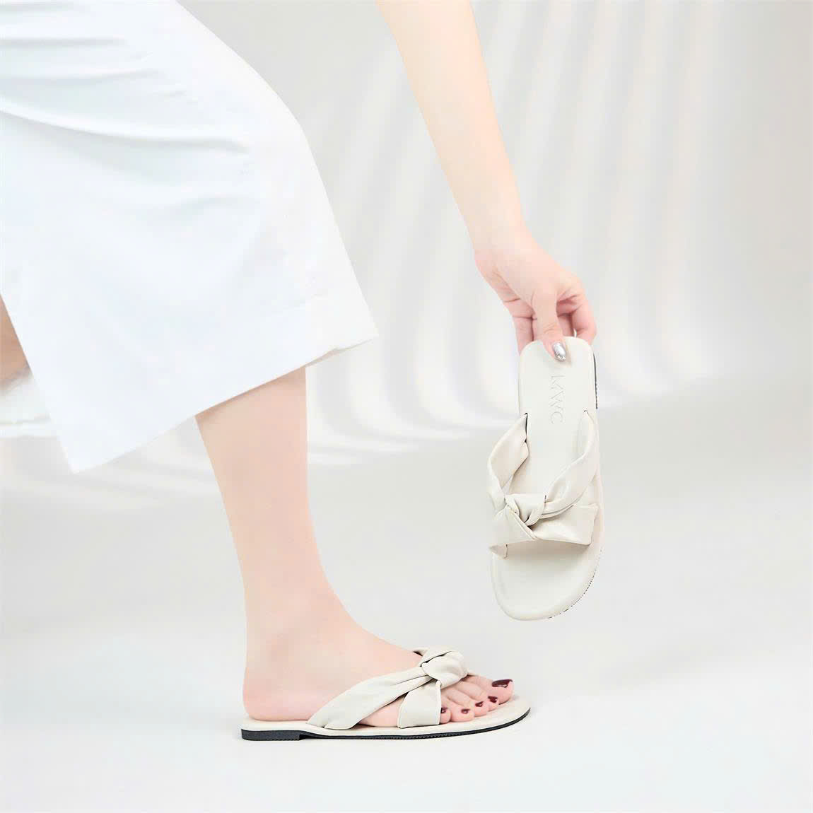 Thiết kế quai ngang thắt nút mềm mại của dép Moonn N23 ôm gọn bàn chân, giúp đôi chân trông thon gọn và nữ tính hơn. Đây là lựa chọn lý tưởng cho những cô nàng yêu thích sự đơn giản nhưng vẫn cần một điểm nhấn tinh tế cho bộ trang phục hàng ngày.