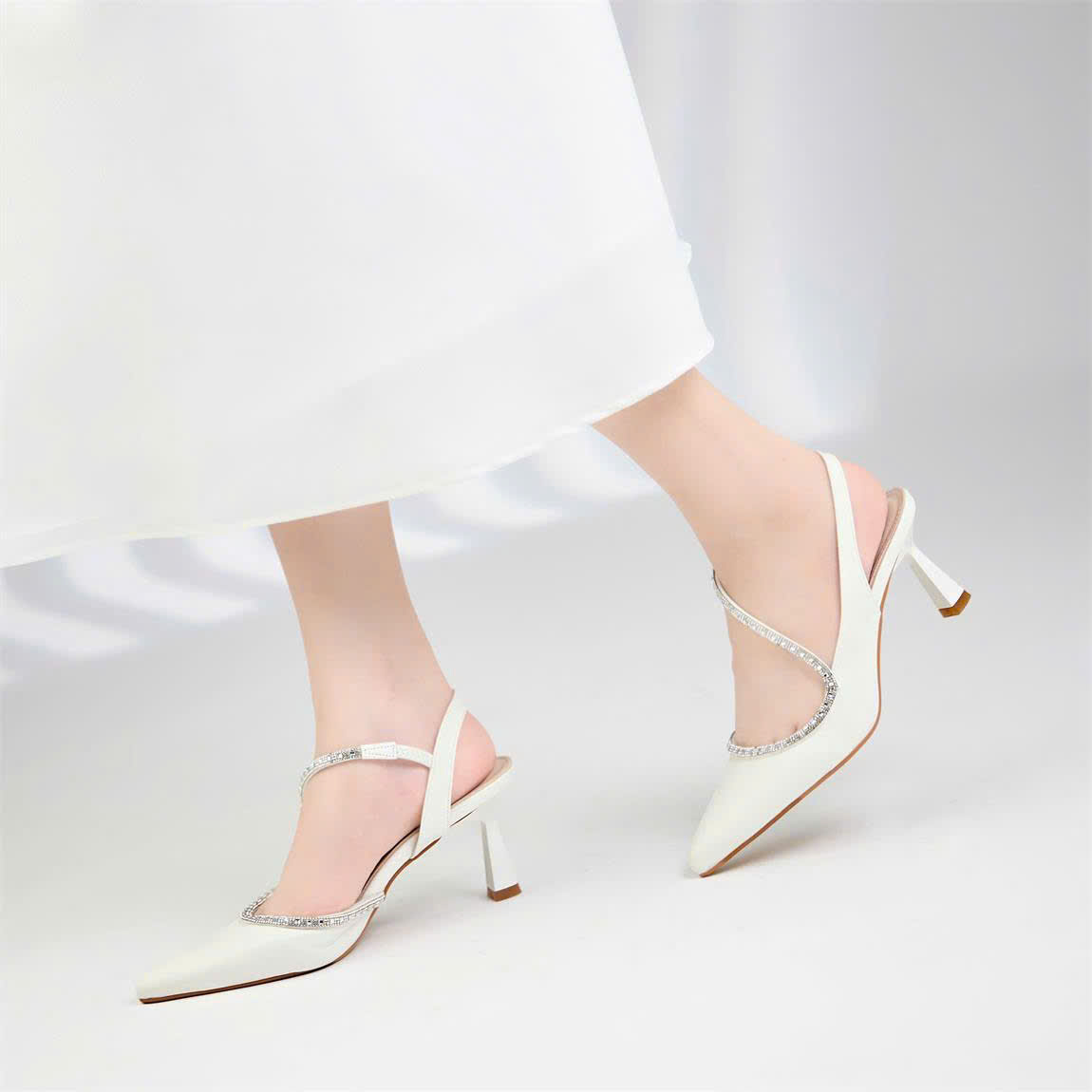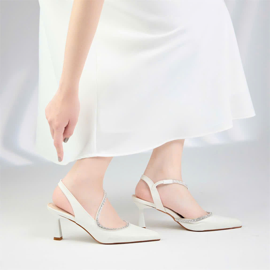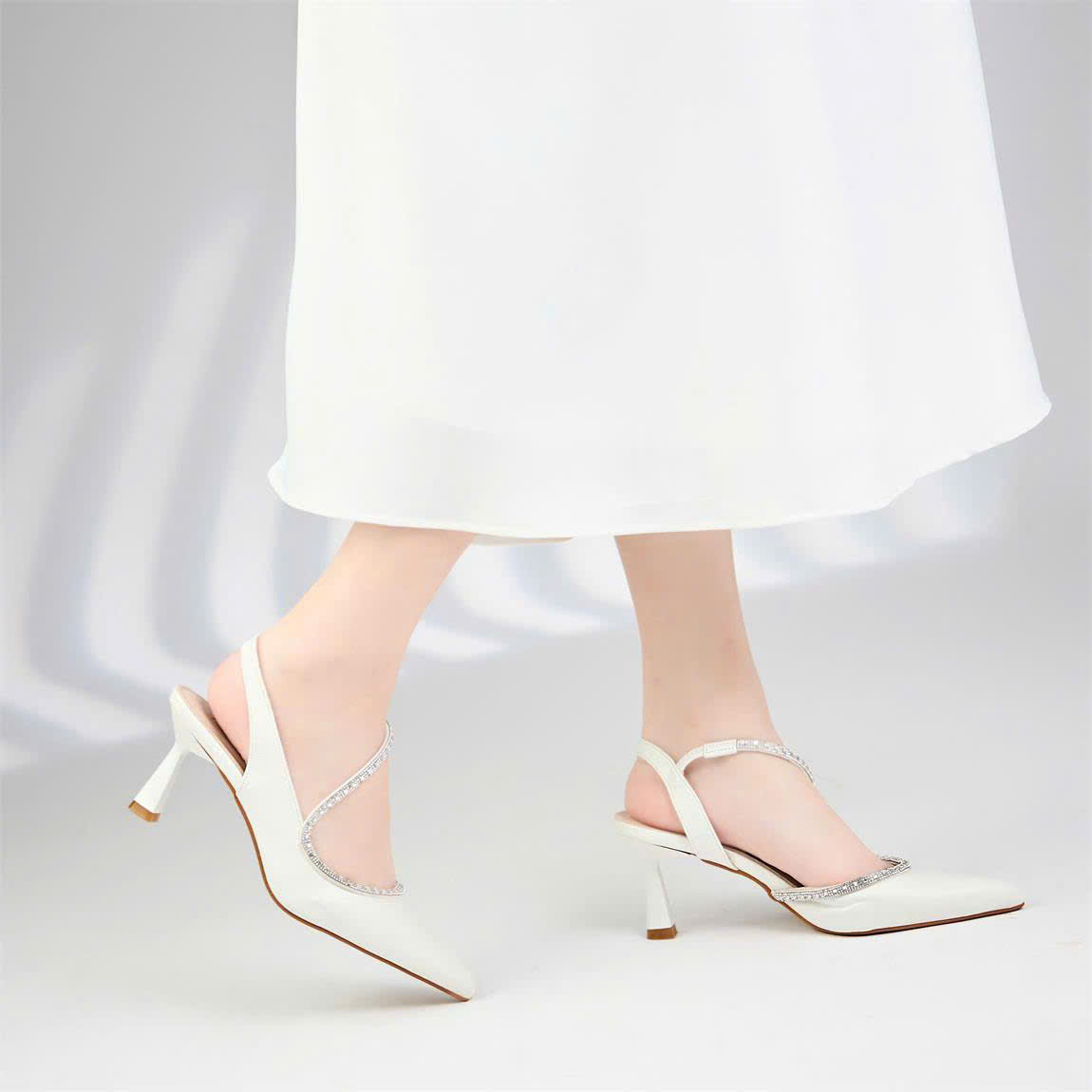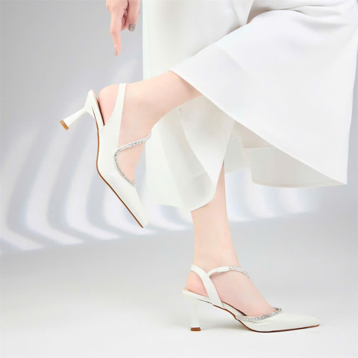 Không chỉ chú trọng vào công năng, cao gót Moonn N06 còn ghi điểm với điểm nhấn là sợi dây đính đá lấp lánh chạy dọc mu bàn chân. Tông màu trắng kem trang nhã của cao gót Moonn N06 rất dễ dàng kết hợp với nhiều phong cách khác nhau như đồ công sở, váy đi tiệc hay trang phục dạo phố sang chảnh.