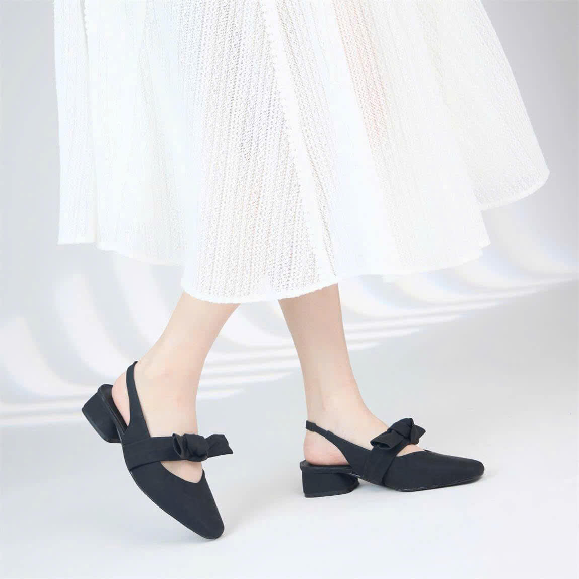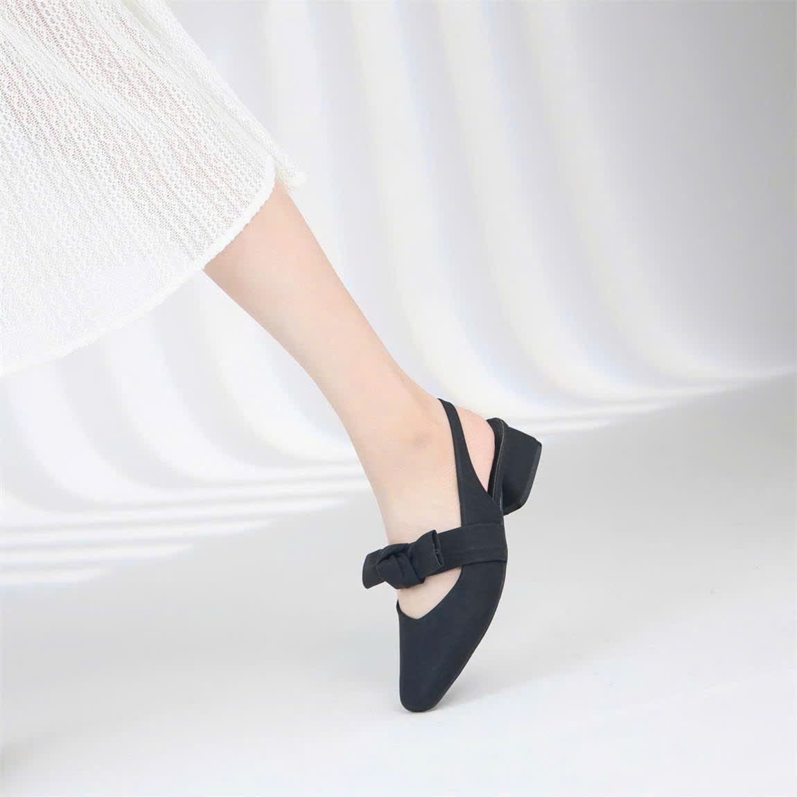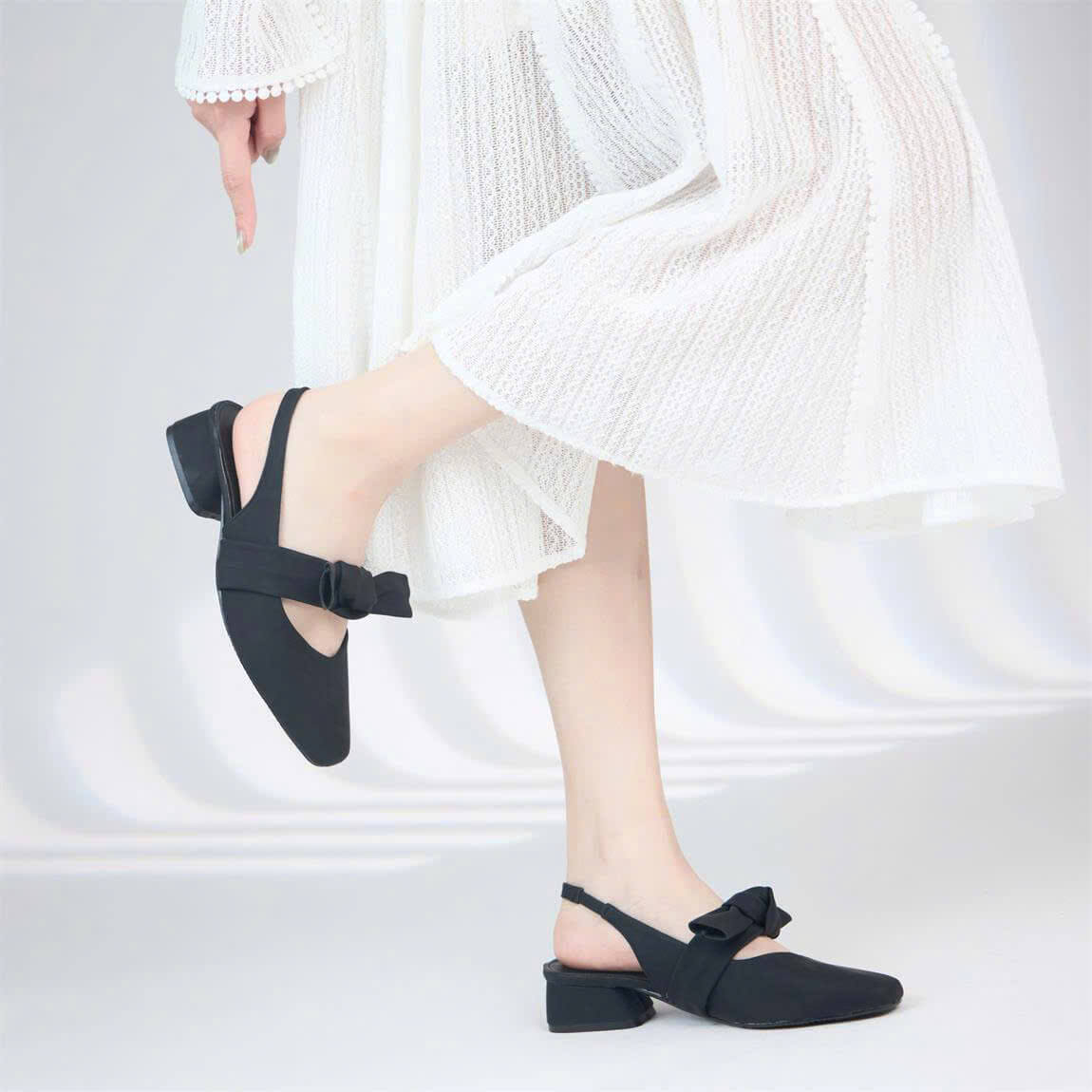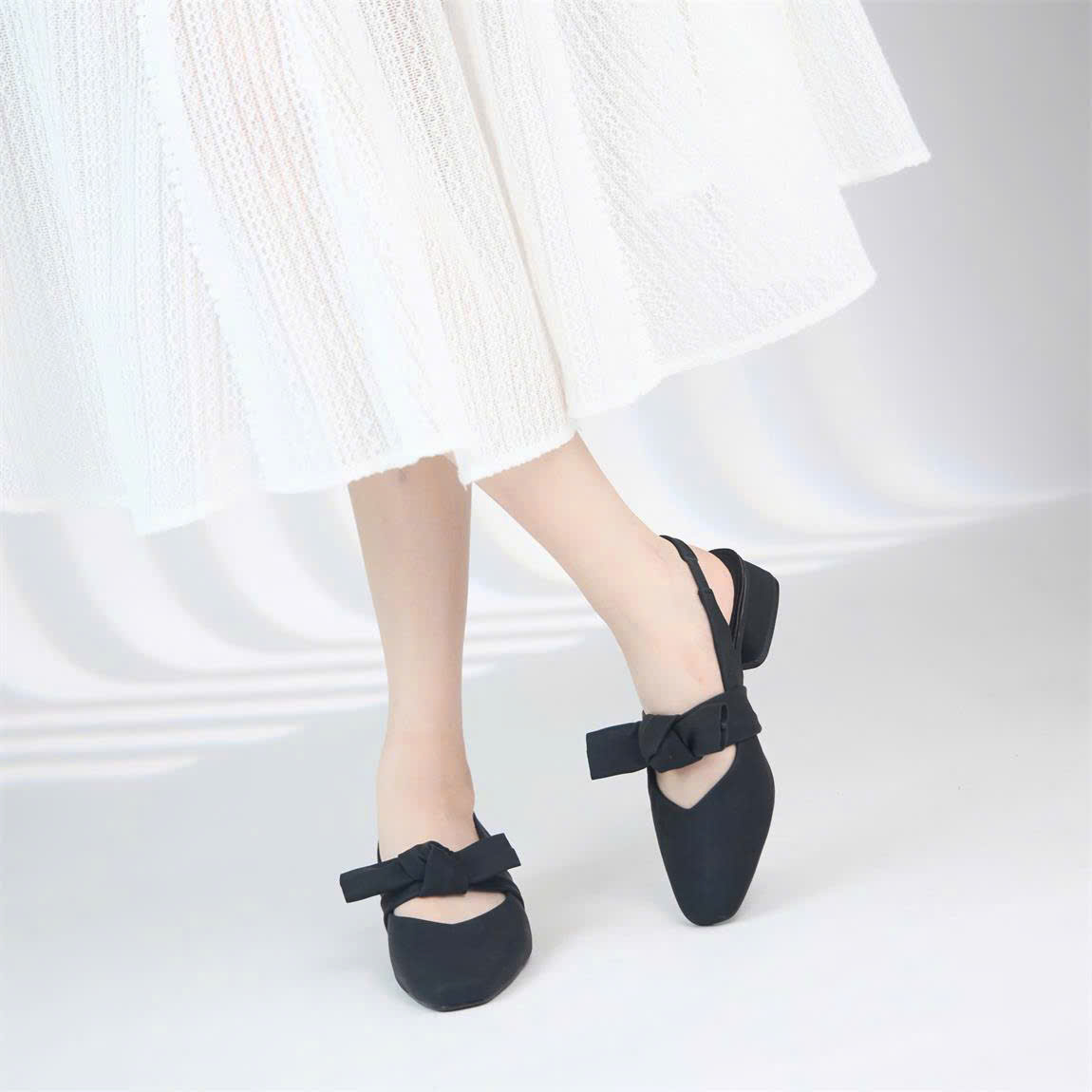 Kiểu dáng: Giày cao gót bít mũi, quai ngang thắt nơ